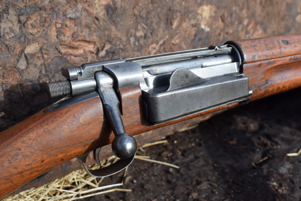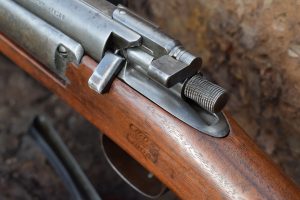 1901 pattern rear sight designed on the sliding ramp principle graduated from 100 to 2000 yards. Also fitted with windage adjustment actuated by releasing a lever at the front which locked the sight into place. Windage graduations at the rear. Open finely machined “U”-notch aiming point which compliments the fine unguarded front sight. Graduations also on side of sight base. The flat steel butt-plate has a trap for the storage of the cleaning gear issued with the rifle – empty. This would consists of a three piece screw-together steel cleaning rod assembly and a nickel steel small oiler, complete with “dabber.” These ancillaries are hard to find. Single shot and magazine feed selection switch to rear LHS of action – functioning fine.