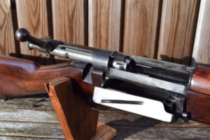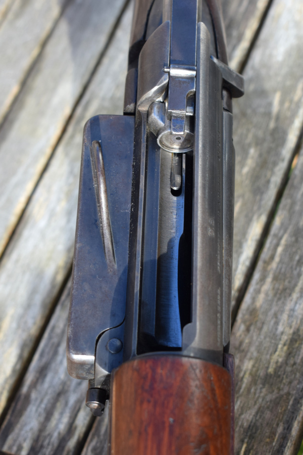 The side loading gate spring remains notably strong, snapping crisply into place—an excellent example of the robust engineering these rifles are known for. Although the design did not allow loading from a clip, soldiers of the era found quick reloading practical with the Mills cartridge belt, a method this rifle was originally intended to complement.