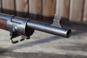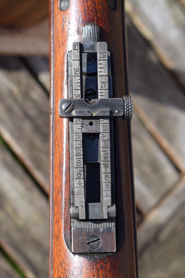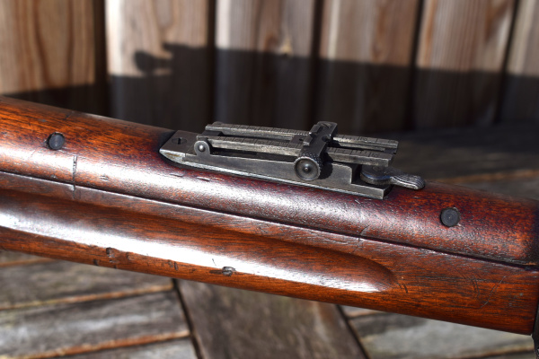Fitted with the 1901 pattern rear sight, this rifle features the classic sliding-ramp design, graduated from 100 to 2000 yards. The sight includes its correct front locking windage adjustment, with crisp graduations at the rear and additional markings along the side of the base. These include the unusual marking which seems to read “4 B”!  The B represents a fixed distance of 375 yards, for battle conditions.  There are four available aiming apatures or points on the sight used for different requirements which the troopers would learn off by heart to obtain better results. It doesn’t take long under inspection, to note that the uprights of the leaf component are machiened unevenly to allow for the Krags tendency to drift to the left; this countered that effect.  The finely machined open “U”-notch aligns perfectly with the unguarded front blade, a configuration prized for its precision craftsmanship.