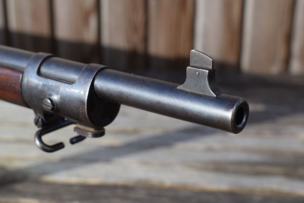 The exposed portion of the barrel has remained mostly blued with age just knibbling at the patina, adding to the rifle’s vintage character. Hardware includes twin sling swivels, a stacking hook, and a front band incorporating the bayonet lug, all consistent with correct military configuration.