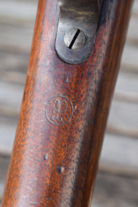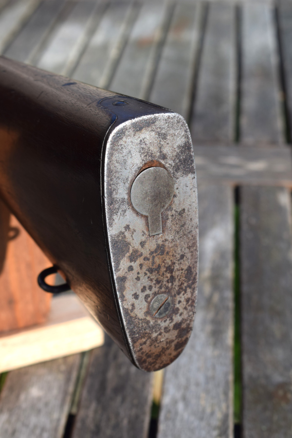 The flat steel butt-plate retains its original trap door, intended for storing the issued cleaning equipment—now empty. These kits originally included a three-piece, screw-together steel cleaning rod and a nickel-steel oiler with its small “dabber,” accessories that have become increasingly scarce on the collector market.