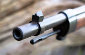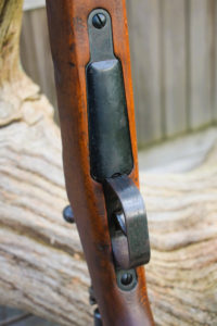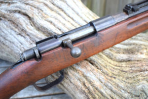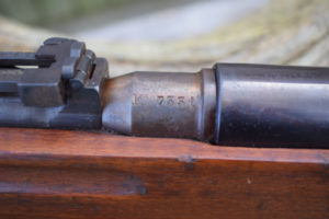 Steel butt-plate. Large steel trigger guard with floor-plate release within, at front. Finger grooved fore-end. Spring retained mid-band with sling swivel. Front top half of barrel exposed, hand guard to rear sights. Front band retains Arisaka type cleaning rod with under spring release behind bayonet lug. Stock is in good condition with only one “graze” along the RHS lower forend worth mention. Metal work is in a mixed state from quite reasonable polished blueing back to almost rust brown fittings, and everything inbetween. Strong bore with good rifling, a little dirty; could do with a new keepers care and attention. UK proofed. An interesting collection of rifle designs merged into one functioning weapon – a must for anyone interested in Military Rifle design. In the UK this is now a rare rifle as not many were actually built back in the mid 1930’s when they were originally ordered.