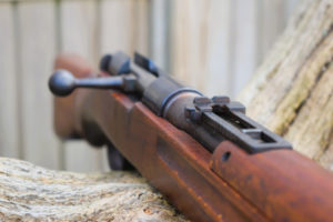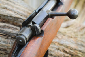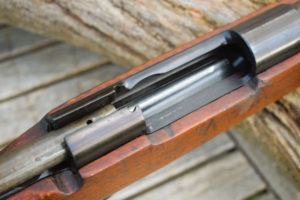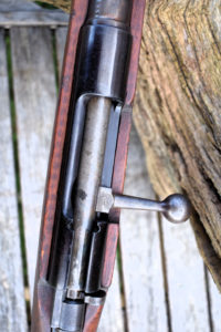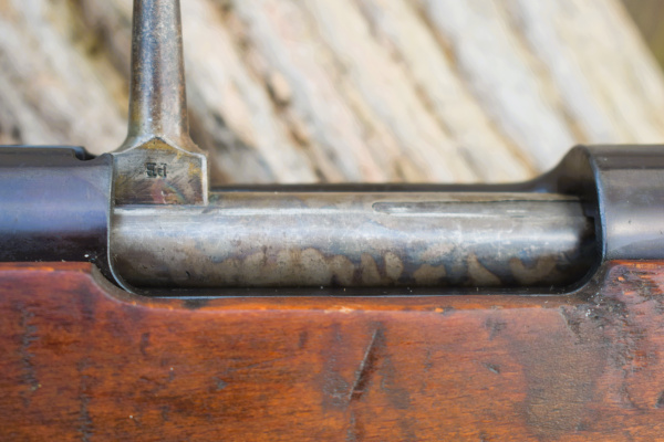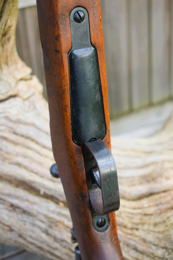 The Type One ended up with a Carcarno action and an Arisaka (Mauser derivative) magazine. It is also very similar to the Type 38 and uses the same round with a five shot internal magazine. The round is the 6.5 x 50mm as used in all the Japanese Arisakas before the 7.7mm Type 99. It can be clip fed through the rear action bridge with the bolt withdrawn fully to the rear. The bolt actually cocks on opening. Visually the bolt appears slim for the action and has a straight bolt arm. There is a safety to the rear. The safety itself is somewhat unusual, it is applied by pressing on the cross hatched paddle against spring pressure and turning it anti-clockwise, whereby, it springs backwards, so setting to safe. As with the Arisaka it is easier to work with the open hand, than with fingers. Twin locking lugs at the front of the bolt. The bolt is case colour hardened which is most obvious upon its underside.