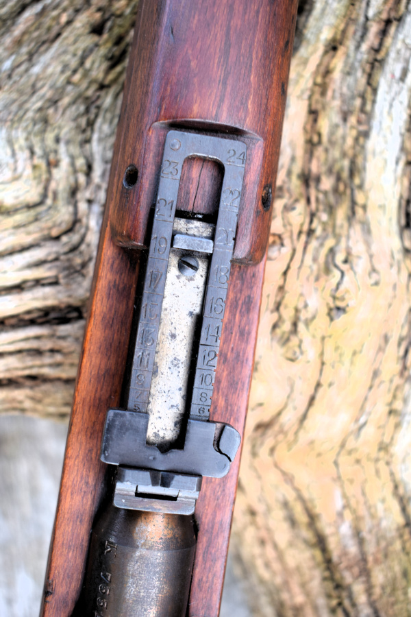 This example was one of 40,000 made by Beretta and has a plain blued action. “PB” is clearly marked on the underside of the bolt handle stub. That is the only visible external marking apart from the serial number, which is on the shoulder of the barrel, behind the rear sights and reads “K7331”. Overall the rifle is 49.1/2″ in length. The round blued barrel is a nominal 30.1/2″ long. The triger Pull is 13.1/4″ to center. Open “V” aperture sights graduated from 500 to 2400 meters. Inverted “V” front sight on a block. Italian (European) Beech or Birch stock with semi pistol grip. Interestingly, they have used the “Arisaka” type of two-piece butt stock design, a good way of saving money on timber.