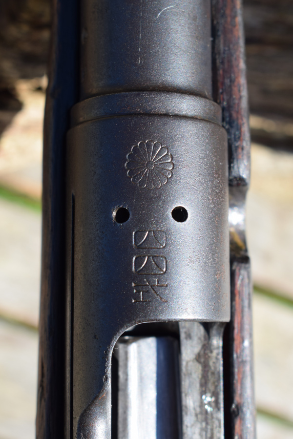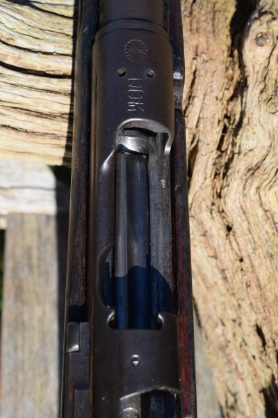 There are differences between the Arisaka and its German cousin. The most obvious is the Mushroom-head cocking piece/ safety device. The other main difference is internal, in that the Arisaka cocks on closing, where the Gewehr does the oposite. The rear end of the bolt has a superbly decorated, slightly domed end to the cocking piece. A notch at about the ten oclock position is the safety indicator. The domed decorated face allows purchase from the open palm of the hand, in wet or sliperry conditions; with a small amount of pressure exerted thus, turning it clockwise, applies the safety. The Japanese preferred this as they were acutely aware of the conditions the rifle would have to function in; and knew the habits of their own troops. It was a brave departure from convention, but the courage of their convictions held and they were proved right. Unlike many others inspected, the cocking piece actually shows wear from much usage around the boundary of the machiened pattern, suggesting much use.