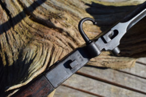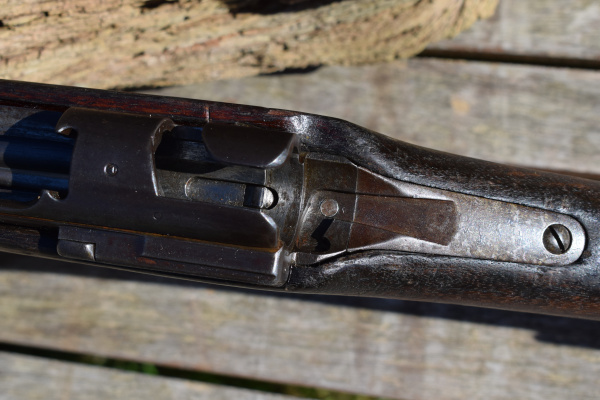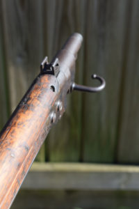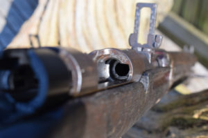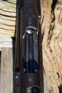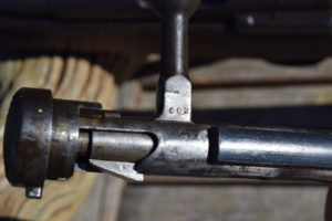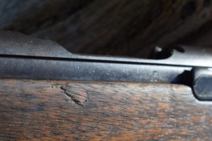 In the side of the butt, at 90 degrees to the butt-plate, is a turn screw that opens the cleaning rod hatch on the rear face of the butt. Interestingly, the two piece cleaning rod is still present – a rare part to find in place. A fascinating feature that the Japanese had to design into their weapons was a water run-off notch in the woodwork. Knowning of the abundence of unwanted water in the jungle, on the Type 44, this appears as a notch in the wasteline of the timber against the receiver ring. The stock has the two piece butt and despite the general conditon of this battle-hardened rifle has not become loose or rattles.