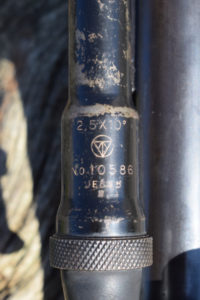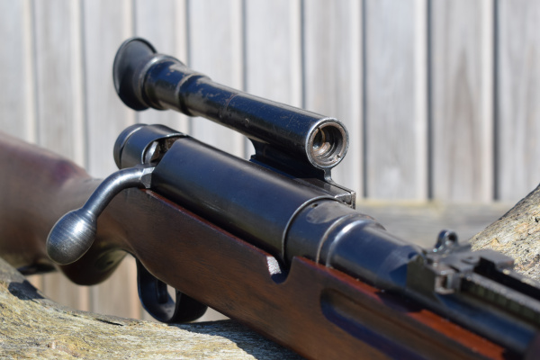 The rifle retains its rear ladder sight and front inverted “v” guarded front sight. All the standard fittings are present including the extra monopod which pivots from the mid-band. All other stock fittings are present and in good condition. The stock, with finger groves, is in exceptional condition, with minimal signs of use. There is no external rust and all surfaces seem to match with the age of the rifle. Blueing is strong with areas of more wear, colouring to silver-grey. Bore is good with strong rifling and no obvious pitting. Grooves are dark – may well clean with new keeper effort and use. Finish on scope is paint – black which is mildly flaking off in areas.