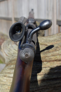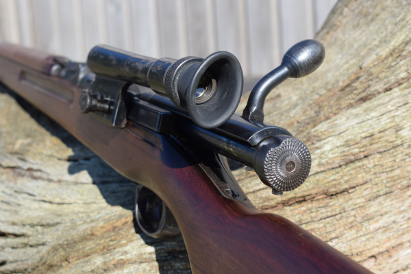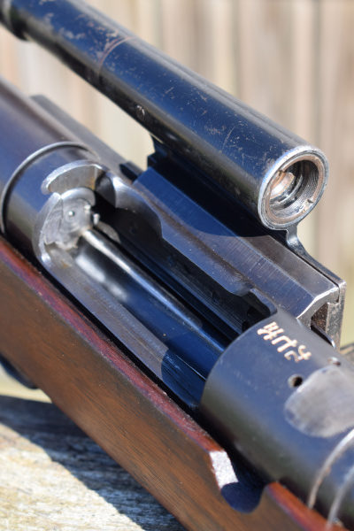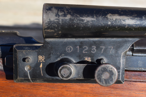 The lower half of the scope mounting system is attached to the LHS of the action outer wall, just infront of the mauser-type bolt release catch. The fixed or “female” side of the mount presents a dovetail for the scope mount upper to slide in to. A longditudinal leaf spring, clips closed behind ,when it reaches the correct position. The male part of the dove-tail is made as one piece, with the front half of the scope tube. A floating central section of the dove-tail is pulled tight into position to lock the scope in place by a rotating lever that travels through 180 degrees from locked to the oposite position, each marked with the correct Japanese characters. Focus is taken up by rotation of the rear section of the scope body and set in position by set screws on the rear. The scope retains its original rubber eye-piece and has a very sophisticated reticule. The reticule allows for accurately adjusting aim at distance, by graduations of height and windage. The optics give a 10 degree field of view. There are particles of loose paint within, but the whole is intact and the optics very good for such a mild magnification. In mounting the scope off-centre, the designers have retained the ability to load via strpper clip, and also still use the open sights.