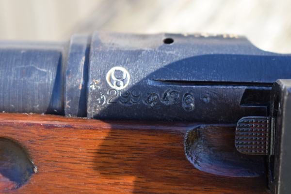 Each scope was tried and tested in the factory and mated to an individual rifle. Afterwards they would be number matched. Unfortunately, this one can not be guarenteed as matching the actual rifle. The number on the LHS of the receiver has been over-stamped so many times it is extremely difficult to tell its original number. There are within the collecting world very few genuine matched examples existant. The intergral scope mount has the number “12377” and the same Circled Inspection mark as the receiver. Because the mount covers the original position for the serial and Arsenal mark, they have been moved forward to the front LHS of the receiver ring. The clear high-lighted Arsenal mark for the Nagoya Army Arsenal is present and the jumbled serial numbers; ” 299924265.” The bolt arm root is stamped “935”. The bolt handle was bent in the factory to enable clearence of the scope. The dust-cover is present but is stamped to the rear; “537” preceded by another Japanese character. Rear face of bolt with elaborately machine cut geometric pattern. Imperial Chrysanthemum has been ground away leaving only the characters meaning “Type 97”.