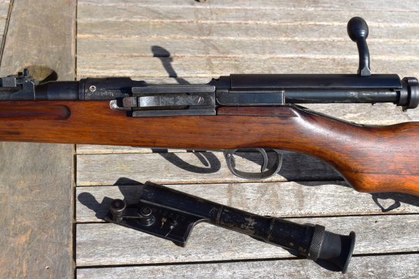 There are not a great deal of differences between the “Sniper’s” version and the en-mass produced Type 38. Few modifications were applied to achieve a perfectly usable and effective weapon. The most obvious is the addition of the scope and mounts. Closer inspection reveals the fact that the bolt handle had to be turned downward, to avoid contact with the scope during cycling. The other addition that does rather leap out, is the addition of the wire monopod, much akin to the examples on the new Type 99. The scope is off set when mounted, on a mechanisum similar to the short side rails seen originating from Europe.