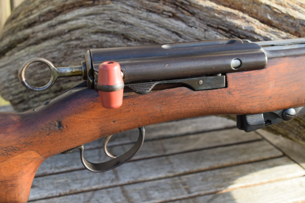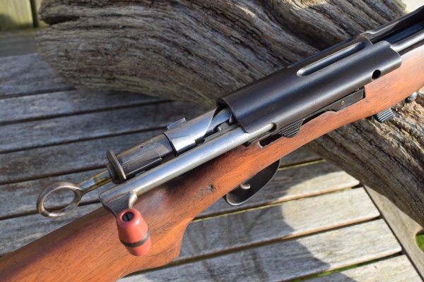 Semi-pistol grip bulge on base of wrist, finger groves below sights in forend. Handguard over barrel and stacking hook with curved tip.  The same impossibly long bolt of the 1889 with the red rubber bolt handle.  Staraight Pull mechanisium, with large cocking ring to rear of bolt.  Three lightening groves in top of action.  Look closely at the bolt face and you can see the off-center firing pin hole. Obviously the bore is .22, still having the inwardly dished muzzle.  Although no purpose is apparent, the magazine is noticeably shorter than the 12 shot big brother, but is still able to be retracted and taken out of battery.