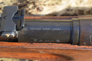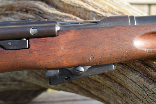 An unusual long rifle to see converted to a small bore caliber.  Not strictly all for Military Training, as many were converted by comercial contractors to equip the small bore competitions held in Switzerland.  Shooting was held in high esteem in the country and nearly all of the male youths of the country had some experience in the field. This rifle was converted by “WALTER HARDIE.  AARAU” as marked upon breech end of barrel upper. Externally almost the same as a standard Model 1889 infantry rifle with one notable exception, the sights are from the M1911 rifle.