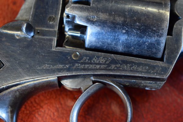 The five shot cylinder is engraved with the matching serial number “23842 R” The “R” suffix of the serial number means this revolver was actually made by the London Arms Company – a fine producer of arms. Between the cylinder bores are the Victorian view and government proof marks. Large steel trigger guard. The flat sprung loading lever pivots upward to allow the ramrod to compress the loads within the bores. The mechanism of which is in very good firm condition with no play. No pitting inside frame when cylinder is removed. Cylinder spindle finished in the white. Excellent checked walnut grips with steel butt cap having the strongest loss of finish. Also a loss of finish over the trigger guard. The lower RHS of the revolvers frame is engraved with the serial number and the following; ” B.8187 / ADAMS’ PATENT No 23842R.” Cylinder lock on lower RHS of frame. Excellent lock up and timing. Overall a great opportunity to add to any serious collection and a beautifully preserved revolver.