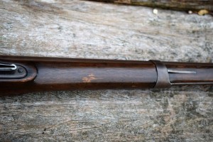 The Lock and its components are in fine condition showing an even plumb brown patina. The official finish for this pattern of musket is “Browned“. The cock and mainspring operate on a two stage position. Two piece trigger guard with smooth trigger. There is a round swelling in the front upright of the trigger bow which, on close inspection shows the original swing swivel screw now filed flat. The steel butt-plate has a clear US stamped into the tang. There is a single mid barrel band which used to take the forward sling swivel and held in position by sprung catches which close behind the band as it is pushed rearward, The front band incorporates a (worn) brass foresight and opening to take the cleaning rod, The bayonet attachment lug is forward of this noseband at twelve o’clock on the muzzle. Full length cleaning rod stored under barrel. Steel side-plate affixed to opposite side from lockplate by two main screws.
