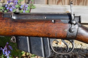 This Mk I* carries the serial number “638 D” on the RHS of the receiver ring and the rear of the bolt arm. The bolt is fitted with a dust cover which is held in place with two screws. It also has a “D” shaped cocking piece. Below the bolt slide is the magazine cut-off and a characteristic indent in the stock below, to aid its use. The rear LHS of the action has the aperture arm for the long range volley sight; the safety which used to reside in this same position has been removed in the upgrade and a new notch-less cocking piece put in place.