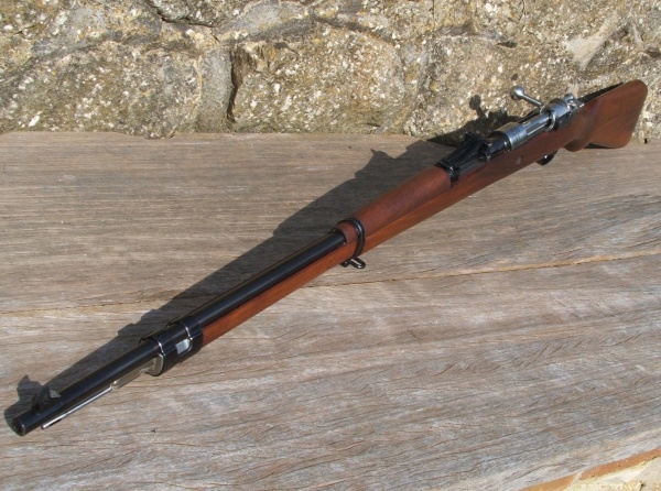 A superbly produced reproduction Gew 98 by Mauser. Serial number 19980713. Chambered in 8 x 57 Mauser with a 5 shot internal magazine. Stocked in an excellent piece of walnut with short hand-guard. True to the original the action is finished in bright steel with the roll stamp engraving picked out in black. This thoughtfully produced rifle is faithful to the original in almost every detail. This is a dead-ringer for the rifle which the Imperial German forces of the Kaiser stomped across Europe with at the time of the First World War.