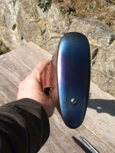 The whole package is a neat weapon, well finished and nicely balanced for use on horseback or Camel for that matter in the case of Algeria. It also found service in Artillery units and Police and Prison guard situations. This particular M1916 carbine is all matching and comes with the correct bayonet & scabbard. It is stocked in French Walnut with a short hand-guard on top of the barrel. The butt of the stock carries a plain smooth steel butt-plate which has retained fabulous colours. The side of the butt is numbered in the same manner as the rifle with the serial number prefixed by a script letter for the series of production, so it reads “A C 31592″ These same script letters appear in front of the serial number as it appears on the rest of the carbine. The stock is in fine condition and it retained by two cross bolts, the action fixings and two sprung bands. The mid band carries the front sling swivel and the front cap has the stacking prong and the bayonet stud attached. There are traces of the other modifications that were made to the carbine, where in 1927 the original cleaning rod was removed from the front LHS of the fore-end and filled with a wooden filler at the armory. This has been extremely well executed and might well not be noticed on a darker stocked example as the fit is excellent.