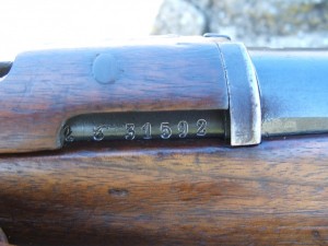 Matching Serial number 31592. Measuring 37.3/8″ in length with a round blued barrel measuring 17.1/2″. With the 20″ bayonet fitted the whole Carbine becomes 52.1/4″ in total length. This M1916 is chambered in 8 x 50 mm Lebel with the chamber marked with a “N” to indicate it took the more powerful “balle” ammunition, and that the French Armory had increased the magazine capacity from 3 rounds to 5 and reamed the chamber. Other parts had been modified like the striker spring, which had been made more powerful to handle the up-rated cartridge.