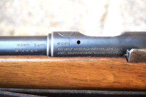 Geco were one of the lesser producers in quantity, which makes this rifle a bit more special. Overall the rifle measures a nominal 43.1/2″ in length. It has a round blued barrel of 25.3/4″ and a trigger Pull of 13″ to centre. Semi-pistol grip solid walnut stock with handguard over barrel. Unfortunately, who ever brought this little rifle home has felt it necessary to “duffle cut” the stock. A practice developed by soldiers not wanting to declare or show the war trophies they brought home. Consequently just behind the barrel band is a very neat joint, attaching what appears to be the front end of a regular K98 to the balance of the stock. Also as a result it is fitted with a regular K98 front band and bayonet fitting – something that was purposely omitted from the original “Sport Model” as too much to pass under the noses of the weapons inspectors. Reason being you don’t normally fit a bayonet to a Sporting Rifle! So in that respect it is not quite correct, but the job has been done well and the timber match is good. Based on the rarity of the Geco as such, this is an acceptable stop gap. If the new owner ever stumbles across a Geco fore end cap then he (or she) may act as they see fit.