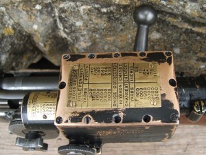 The instrument itself works with prisms inside the brass casing and is fully adjustable externally. There is a simple cross hair and the magnification on this model is of 5.2 times. Many of these items were issued but very few survive today. This one has reasonable original optics. It has a reproduction rubber eye-shade fitted which is pierced with holes to alleviate the suction problems encountered in the early days. Externally it still has all its range information and correction plates fitted.