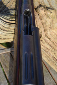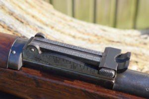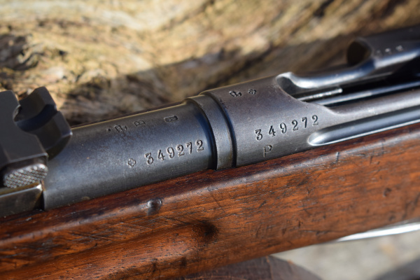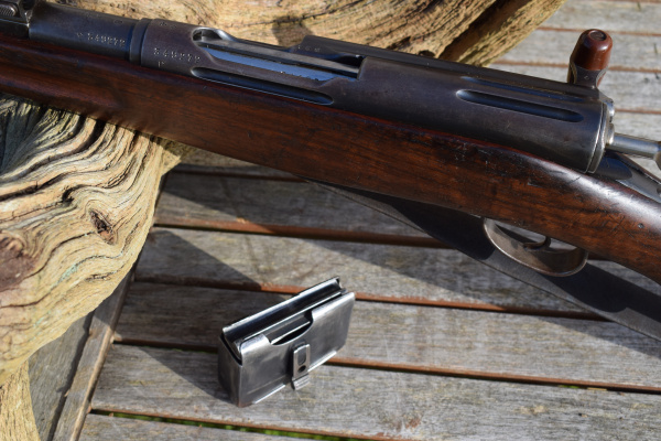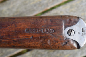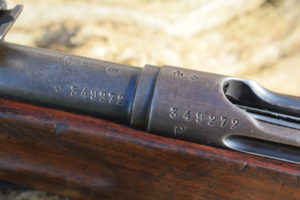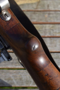 This example is the full length rifle with the 30″ barrel with six round detachable box magazine. S/n 349272 in 7.5 x 55mm. Serial number puts production in approx’ 1912. A solitary “P” has been added meaning the rifle was sold to the soldier it was issued to after his service was over. The breech and barrel have other stamps including, “+/V” for Federal inspection by a Major Vogelsang. The intwined “BP” Proof stamp of Schmidt-Rubin. “B” – unknown possibly Basel the canton? Also, a mark that appears on most parts, an upright small Swiss Cross.