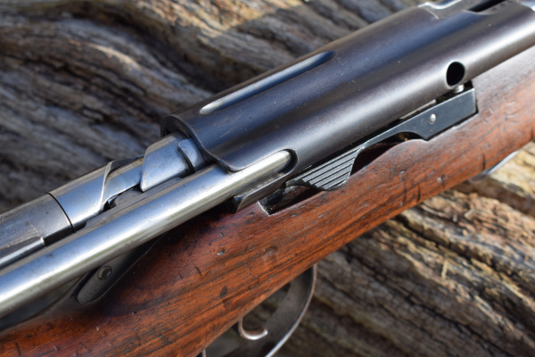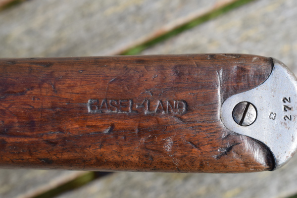 Steel butt plate with “272” and the National Swiss Cross on tang. Just in front on the top flat of the butt is the word “BASEL-LAND”. The side of the stock sports a small Swiss Cross cartouche. Underneath, is the numbered magazine (matching). Rear sights are graduated from 300 to 2000 meters and the bolt handle is of the red bakelite type. Front band incorporates bayonet lug and curved tip stacking hook. Easily recognisable by the large ring manual cocking piece at the rear of the action.
