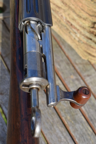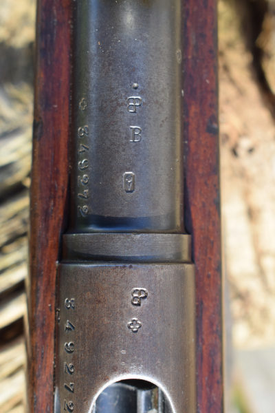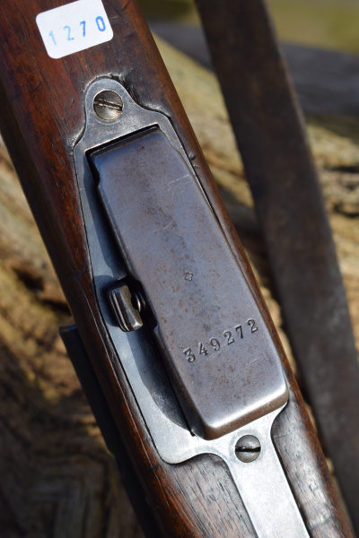 This example is the full length rifle with the 30″ barrel with six round detachable box magazine. S/n 349272 in 7.5 x 55mm. Serial number puts production in approx’ 1912. A solitary “P” has been added meaning the rifle was sold to the soldier it was issued to after his service was over. The breech and barrel have other stamps including, “+/V” for Federal inspection by a Major Vogelsang. The intwined “BP” Proof stamp of Schmidt-Rubin. “B” – unknown possibly Basel the canton? Also, a mark that appears on most parts, an upright small Swiss Cross.