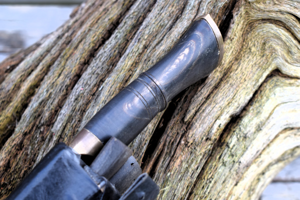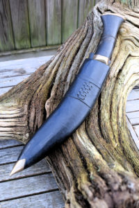 Buffalo horn handle with flared pommel and brass cap.  The handle has the classic ridge around the handle to aid grip as there is no guard.  Overall length is approximately 15″ in total.  It comes in its parade scabbard of black leather with a brass chape.  It has the two pockets at the rear and contains the two small tool like knives. However, one is not a knife but a striker for fire starting.  Belt loop to rear.  A classic knife for any collector.
